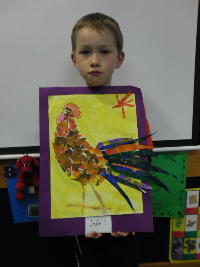 We based our art on Eric Carle's book "Rooster's off to see the world."